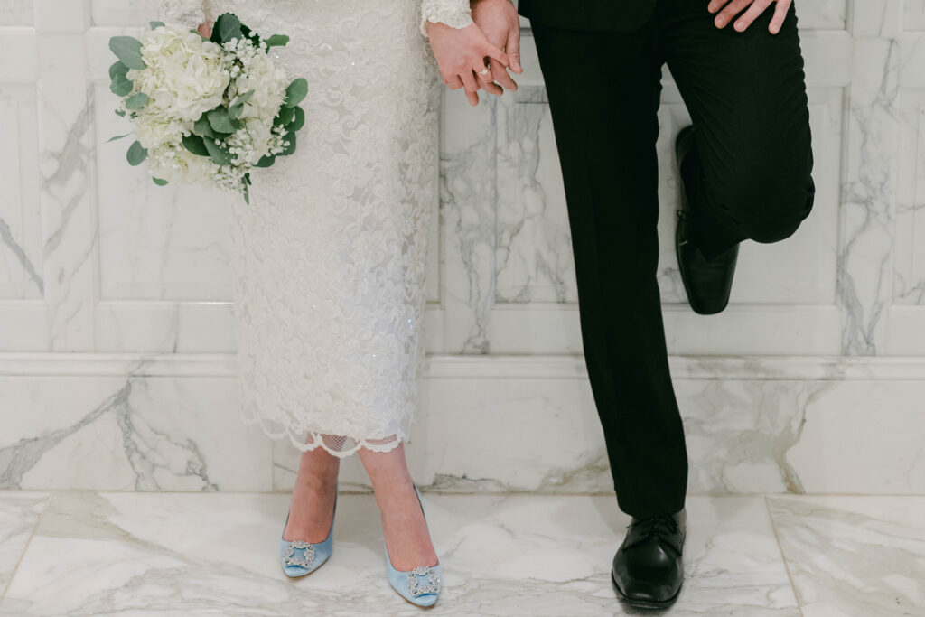 We began the afternoon with bridal portraits in Downtown Kannapolis, North Carolina. Because of the impending winter weather, Chapel and I were able to have time alone to capture just her and she bravely stepped into the cold with so much grace! She wore her mother’s lace, midi wedding gown and a pair of the iconic blue, satin Manolo Blahnik heels from Sex in the City (iykyk)!